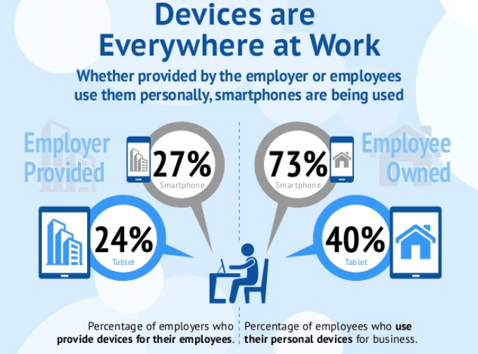 Before we jump into mobile security issues and implementation plans for employee mobile devices, it’s important to discuss the difference between employer-owned devices and BYOD smartphones.Every business wants to protect their data, as well as the data of their clients or customers. This has placed emphasis on the type of device businesses should (or shouldn’t) provide.Currently, only 27 percent of businesses provide their employees with mobile devices. The rest of the smartphones used in the workplace are already owned by the employees.