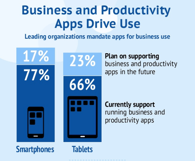 Since many C-suite executives are seeing the benefits, 17 percent more businesses are expected to join in the mobile workforce trend. This trend will almost ensure that all employer-backed mobile devices fully support business and productivity apps.Supported software will include a mix of custom company-built applications, third-party business applications, and more common productivity apps for iOS and Android devices.